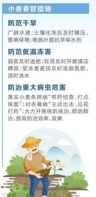 4、防治重大病虫危害。对今年春季病虫害要监测预警、分类防控,落实小麦条锈病“带药侦查,打点保面”,对赤霉病“主动出击,见花打药”。各地可通过政府购买服务等方式,大力开展统防统治、群防群治,提高防治效率、效果,遏制重大病虫蔓延和危害。