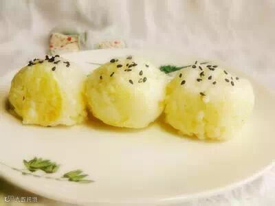 1、们好的米饭稍稍晾凉后揉成饭团(手上沾些水就不粘手了)