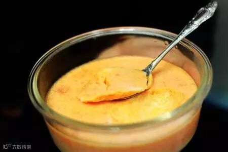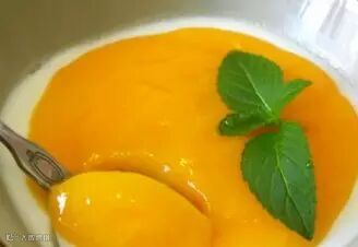 5、芒果打成泥,浇在放凉的双皮奶上,冷藏后更爽滑哦