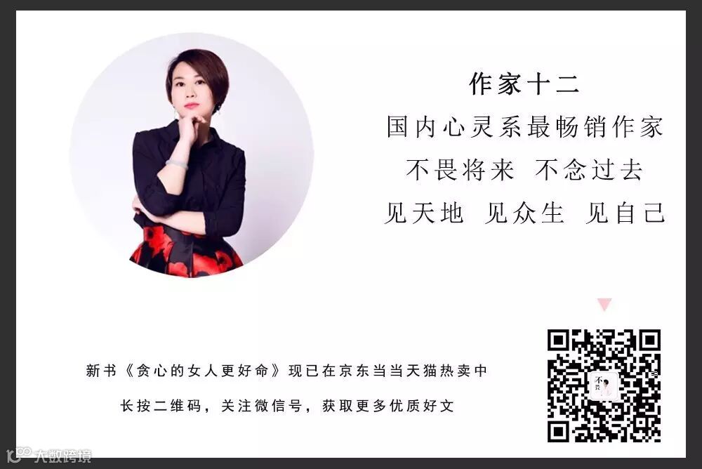 本期作者:十二。一个女作家(年龄颜值保密)。出过几本书,百万读者放在枕边阅读。她是最温暖的闺蜜,也是最犀利的导师,带你穿越最迷茫的那段人生。新书《贪心的女人更好命》正在热卖中,找她请搜索公号:不畏将来不念过去(ID:shier1213),或微博搜索:十二—不畏将来。