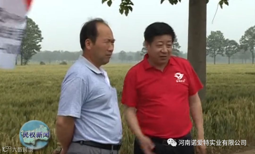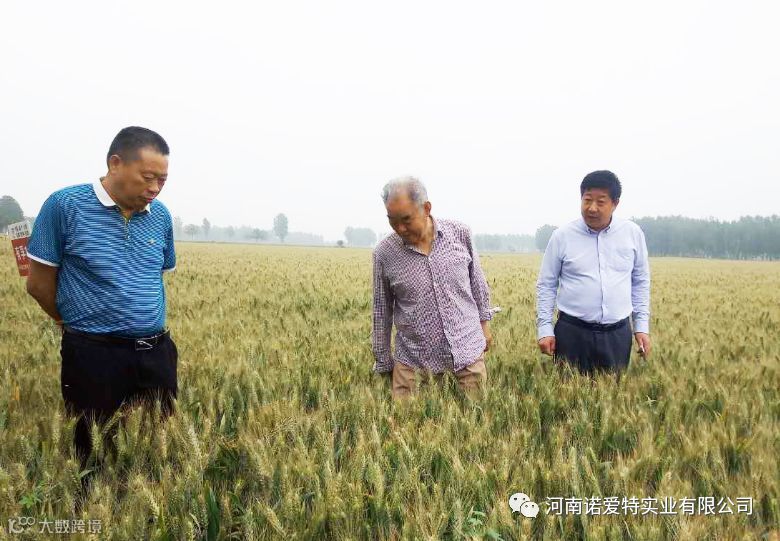 舞钢市农技推广中心潘树华主任(左一)考察有孚1号基地,潘主任指出,有孚1号的穗大杆壮表现非常不错,其优秀的抗病、抗倒、抗冻能力也是优质麦中的佼佼者。