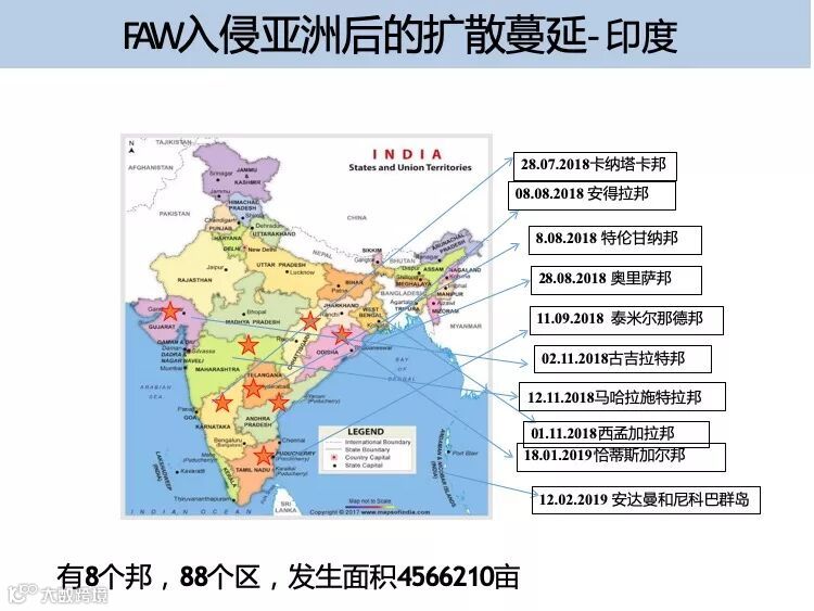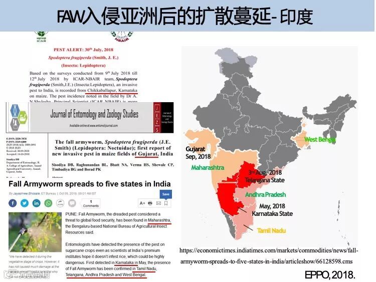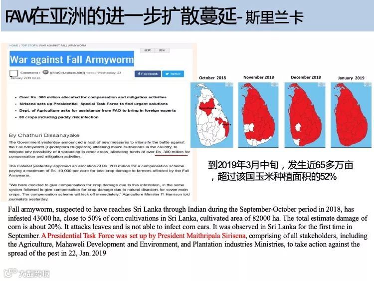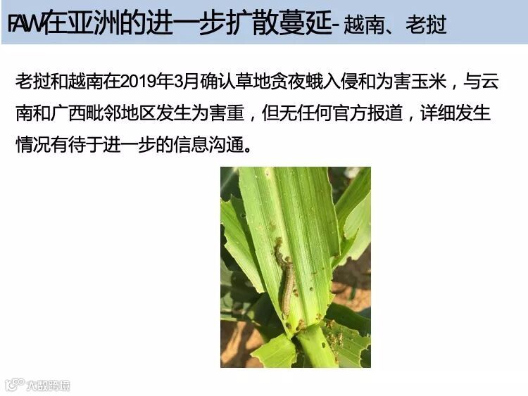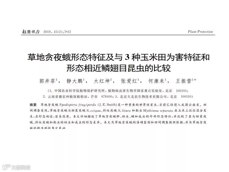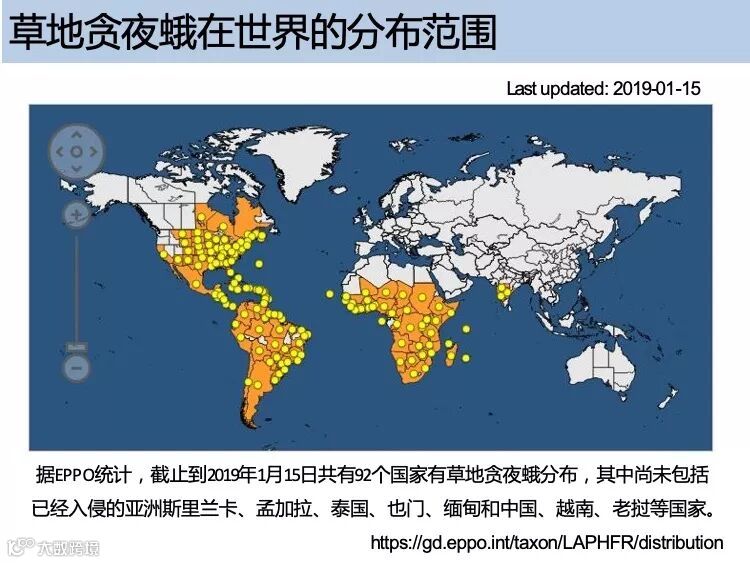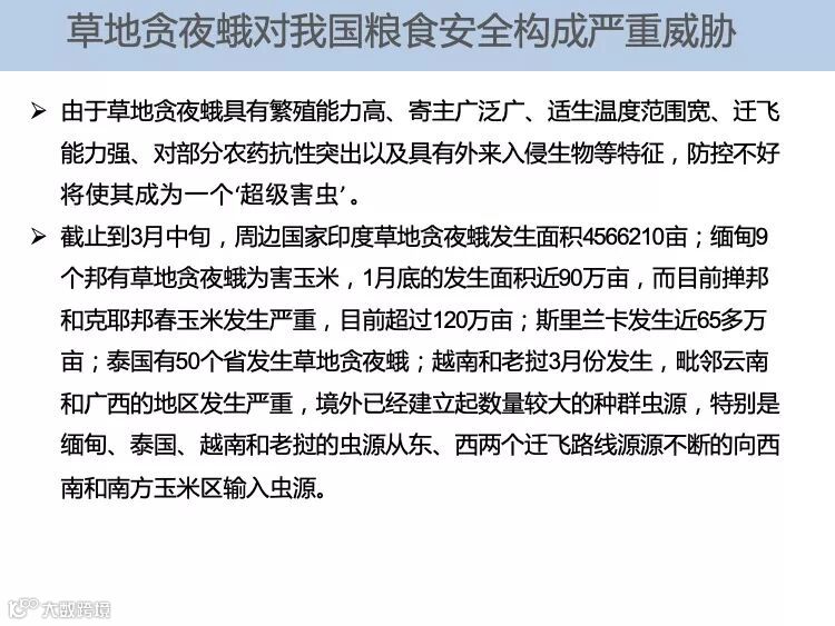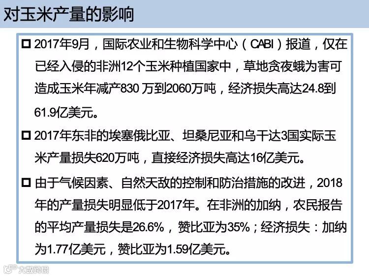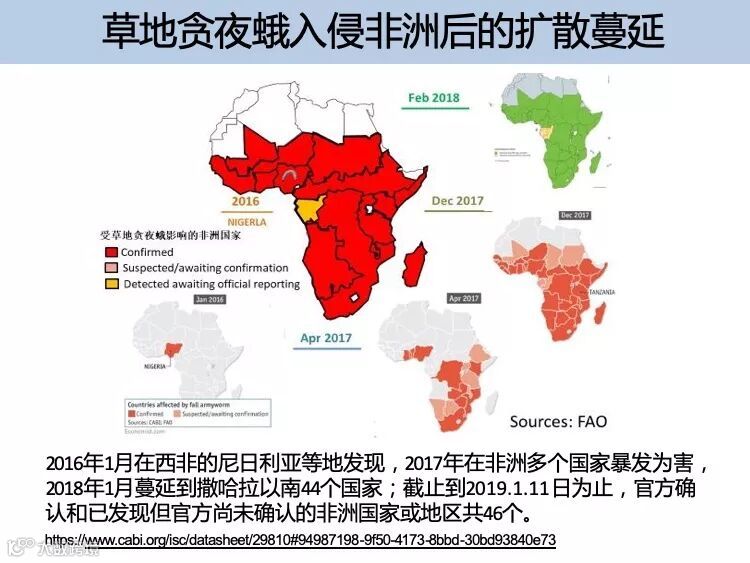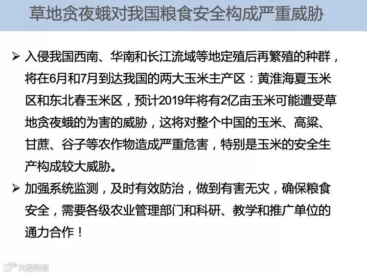 草地贪夜蛾起源于美洲热带和亚热带地区,广泛分布于美洲大陆,具有适生区域广、迁飞速度快、繁殖能力强、防控难度大的特点。2018 年在非洲造成 高达 30 亿美元的经济损失,是联合国粮食及农业组织(FAO)全球预警的重要农业害虫。2019 年 1 月 13 日确认传入我国云南省,截至 5 月 10 日已在我国 13 个省份发现。专家分析预测,草地贪夜蛾将从我国华南玉米区向黄淮海夏玉米主产区及西北、东北玉米主产区等地蔓延,有可能形成局部虫灾。