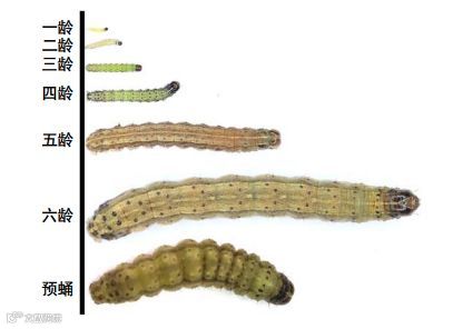 幼虫:幼虫浅绿色至暗褐色,带有纵条纹。第6龄体长3-4 cm。幼虫有8只腹足,其中1对位于最后一节腹节上。刚孵化时为绿色,带有黑色线条和斑点,随着虫体发育仍保持绿色或变为淡褐色,具黑色背线和气门线。一旦种群密度大而食物短缺,老熟幼虫几乎全为黑色,进入行军虫阶段。大龄幼虫头部为典型的黄色倒Y形,背部黑色毛瘤具长毛(在每节两侧发白的背部区域),腹部末节的4个黑点呈正方形排列。幼虫通常为6龄,偶有5龄。