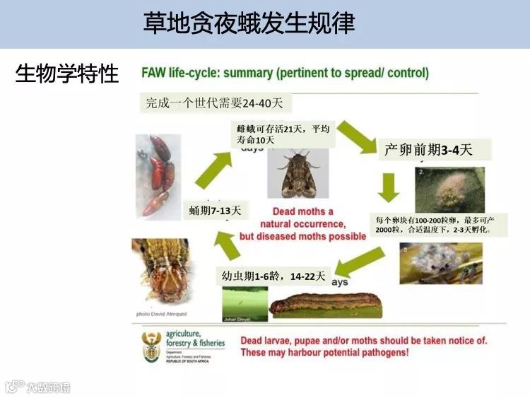成虫夜间产卵,卵粘在寄主植物下层叶片的背面,100-300个卵块紧簇,有时分为2层,通常覆盖有雌虫腹鬃保护层。孵化需2-10天(通常为3-5天)。幼龄幼虫在轮生叶深处取食,1-2龄在幼叶表面群体取食,可出现典型的症状“叶窗”,可致生长点死亡。大龄幼虫会自相残杀,因此通常每个轮生叶中只有1-2头幼虫。幼虫发育至六龄的速度受食物和温度条件的影响,通常需要14-21天。大龄幼虫夜间活动,除非进入行军虫阶段,群集扩散,寻找其他的食物源。该害虫在土穴的茧中化蛹,也有少数在寄主植物的叶间化蛹,蛹期为9-13天。成虫在夜间羽化,产卵前飞行数公里,有时可远距离迁移。成虫平均存活12-14天,卵期2-5天。幼虫有6个龄期,在25℃条件下,1-6龄幼虫的发育期分别为3.3、1.7、1.5、1.5、2.0和 3.7天;幼虫在白天的强光下会躲藏;幼虫期夏天时约为14天,寒冷季节约为30天。老熟幼虫钻入土表下2-8cm下结松散的茧化蛹,若土壤过硬,幼虫会用丝网把碎叶片和其他材料缠绕在土表结茧;蛹期夏天约为8-9天,冬天可达20-30天。成虫羽化3-4天后开始产卵,雌虫一般在其存活的前4-5天产下大部分卵,有时产卵持续可达3周;成虫寿命7-21天。成虫夜间活动,在温暖、潮湿的夜晚活动力更强。