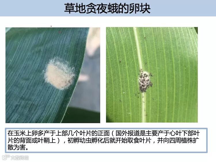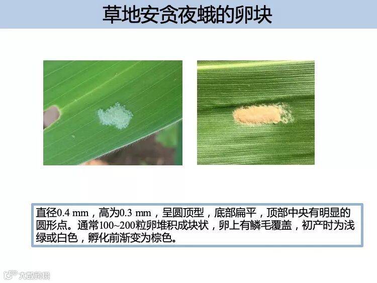 卵:通常 100 ~ 200 粒堆积成块状,多由 白色鳞毛覆盖,初产时为浅绿或白色,孵 化前渐变为棕色。卵粒直径 0.4m m , 卵高 0.3m m。卵多产于叶片正面,玉米喇叭口 期多见于近喇叭口处。适宜温度下,2 ~ 3d 孵化。