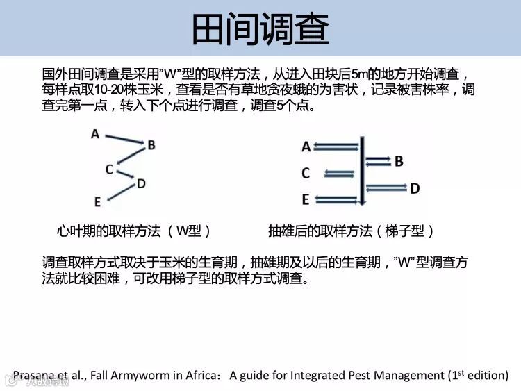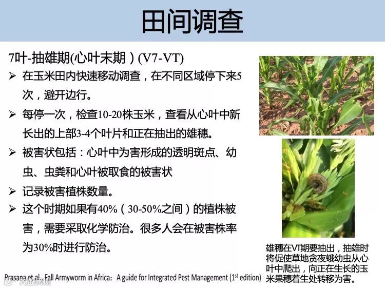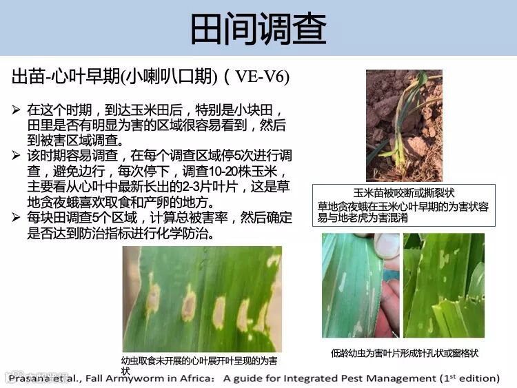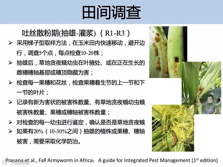 抓住低龄幼虫的防控最佳时期,施药时间最好选择在清晨或者傍晚,注意喷洒在玉米心叶、雄穗和雌穗等部位。可选用防控夜蛾科害虫的新型高效低 毒药剂喷雾防治。防治指标:玉米田苗期被害株率大于 10%,大喇叭口期被害株率大于 30%,穗期被害率大于 10%。联合国粮食及农业组织推荐及国外应急防控该害虫的化学药剂有氯虫苯甲酰胺、氟氯氰菊酯、溴氰虫酰胺等。中国农业科学院植物保护研究所科研团队通过室内药效试验和田间小区试验,防效较好的药剂有氯虫苯甲酰胺、乙基多杀菌素和甲氨基阿维菌素苯甲 酸盐等化学农药以及多杀菌素、苏云金杆菌、白僵菌等生物农药。