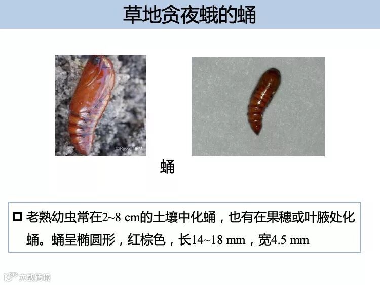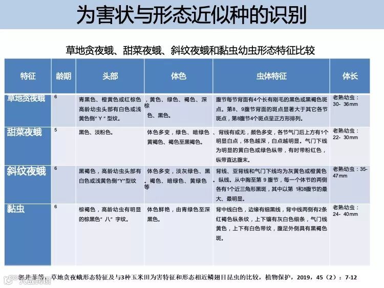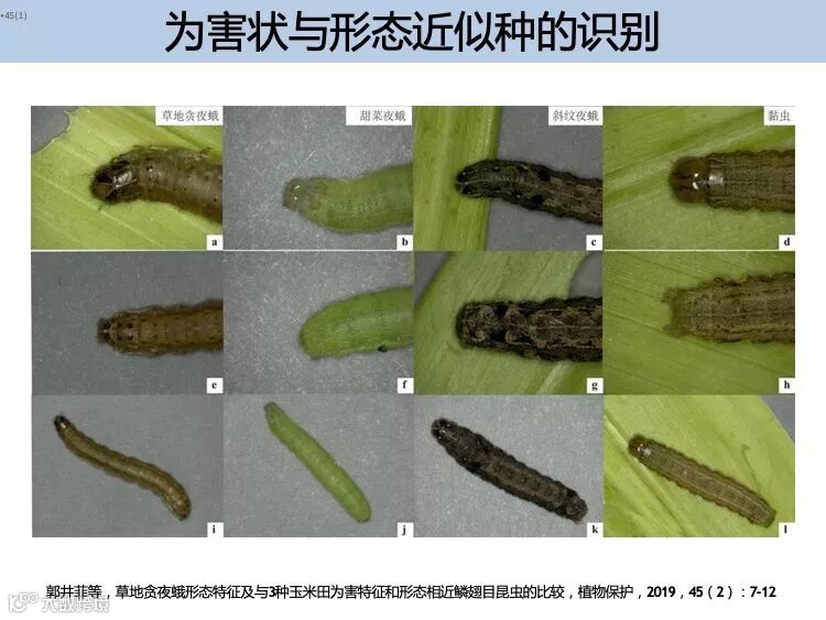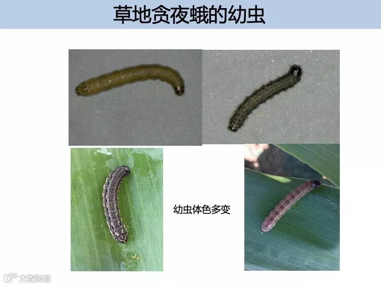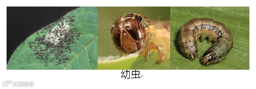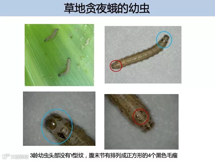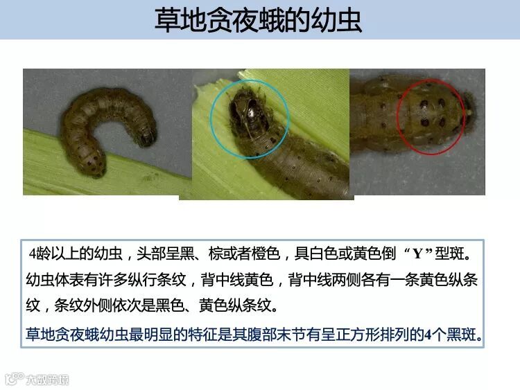 幼虫:一般有 6 个龄期,体长 1 ~ 45m m , 体色有浅黄、浅绿、褐 色等多种 , 最为典型的识别特征是末端腹节背面有 4 个呈正方形排 列的黑点,三龄后头部可见的倒 Y 形纹。