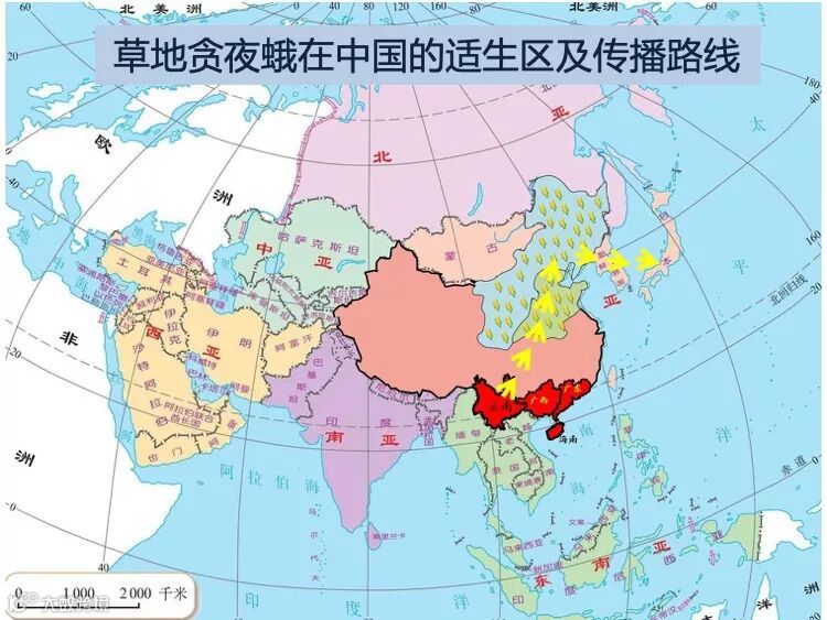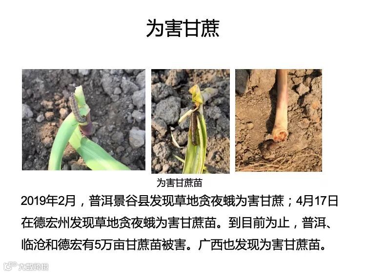 该害虫广泛分布于西半球较温暖的地区。大量幼虫会导致植物落叶及产量损失,然后幼虫以夜盗虫方式迁移到邻近地区。幼虫给植物产量造成的损失可达10%-100%,当植株高度为40-60 cm时产量损失尤大。成虫白天躲藏在落叶层、杂草或荫蔽处,夜间较为活跃,可被亮光吸引,实现长距离迁移扩散。