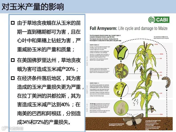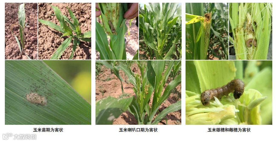 该害虫在玉米上造成的危害最为严重。据统计,玉米发育中后期的轮生阶段55-100%的植株感染该害虫时产量损失15-73%(Hruska和Gould,1997)。在美国佛罗里达州,草地贪夜蛾为害可造成玉米减产20%。在一些经济落后地区,其为害造成的玉米产量损失更为严重,如在中美洲的洪都拉斯,其为害可造成玉米减产40%,在南美的阿根廷和巴西,其为害可分别造成72%和34%的玉米产量损失。