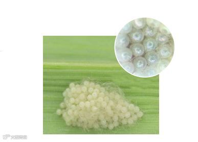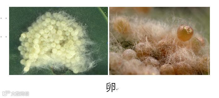 卵:球形(直径0.75 mm),在产卵阶段为绿色,孵化前期变为浅褐色。卵成熟需要2-3天(20-30℃)。通常以卵块形式产卵,每卵块约包含150-200粒卵,在叶面上堆积为2-4层。卵块通常覆有起保护作用的灰粉色雌虫腹部毛鳞。每头雌虫可产卵1500粒左右。