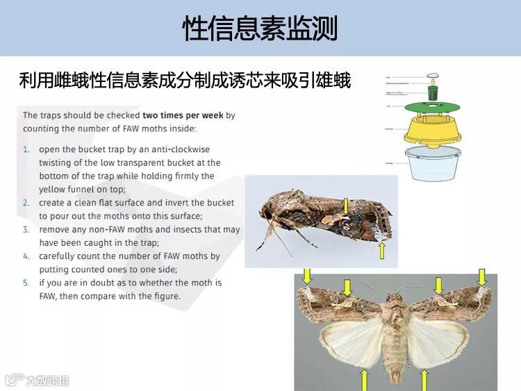检查寄主植物叶部是否有幼虫,若发现为害迹象要认真检查周围是否有虫体存在。也可应用性信息素或灯诱进行监测诱捕。