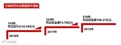 2018年,证监会紧扣风险防范和稳定发展,聚焦重点领域和市场关切问题,依法严肃查处了一批大案要案,行政处罚数量维持高位,2018年行政处罚决定310件体现出稽查执法高压态势常态化。