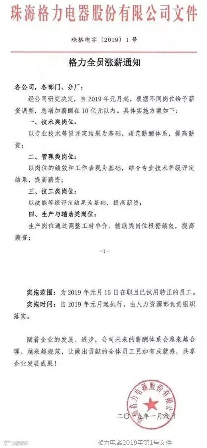 这是格力电器在2019年的第一份文件,也是董明珠担任格力电器最近这3年里,连续3次加薪了。