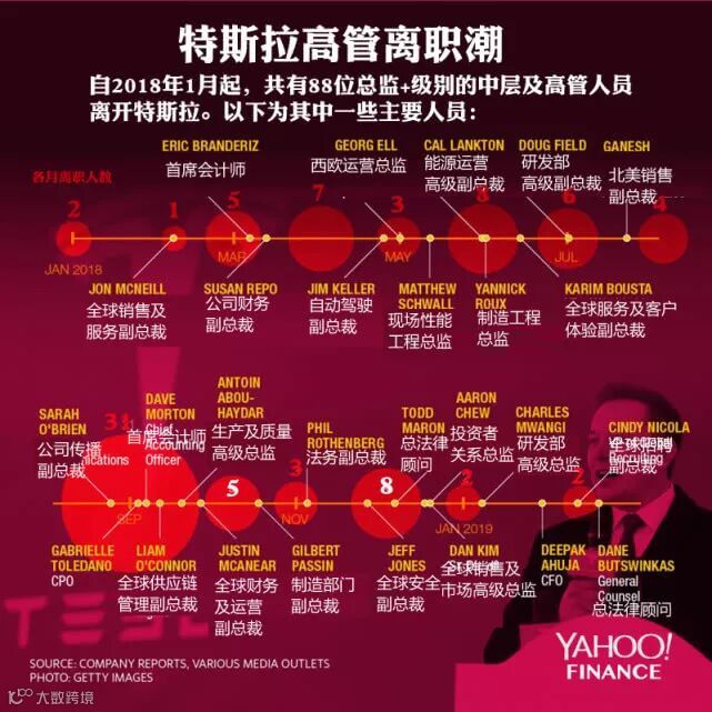 最近几个月,特斯拉的高管更替率呈指数级上升。随着前总法律顾问戴恩·布特斯温卡斯和前首席财务官迪帕克·阿胡贾最近高调离职,人员流动尤其集中在法律和财务部门。你可以在这里找到特斯拉高管最近离职的名单。据路透社报道,自2016年以来,40名“高级”特斯拉高管已经离职,而雅虎财经仅在2018年就将这一数字定为88人。