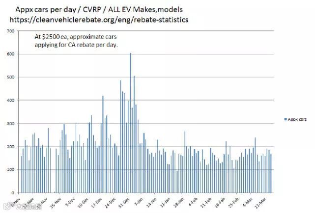 此外,在3月的前两周,根据加州电动车补贴计划申请退税的电动车数量没有明显变化。电动车需求水平仍远低于2018年第四季度的水平。