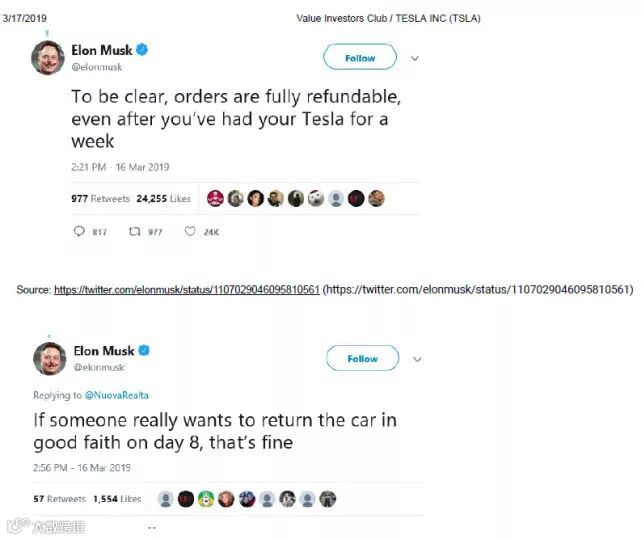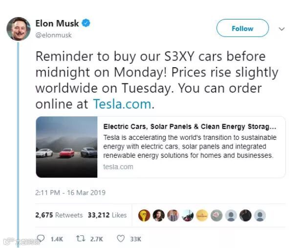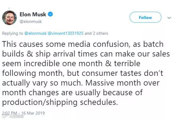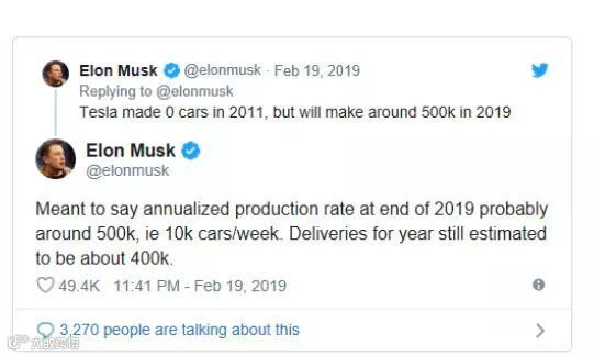 今年2月19日,马斯克发推文称特斯拉2019年将制造约50万辆电动车。相比较而言,该公司在此前发布的致股东信中曾表示,2019年的电动车交付量约为36万辆至40万辆。据推测,在与特斯拉的“推特保姆”疯狂交谈后,马斯克更新了他的评论以澄清评论。
