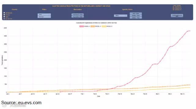 进入第一季度,特斯拉认为欧洲和中国的Model 3需求将抵消美国的需求气穴。也就是说,欧洲和中国的需求大大低于预期。分析师预计特斯拉2019年第一季度将在欧洲销售超过2.5万辆Model 3 型汽车,但实时数据显示,该公司正朝着接近1万辆汽车的方向发展。截至3月16日,特斯拉在挪威、荷兰和西班牙(拥有每日注册数据的欧洲市场)共售出3821辆Model 3,457辆Model X和291辆Model S。注: 2018年荷兰是特斯拉在欧洲的最大市场,挪威是特斯拉在欧洲的第二大市场。
