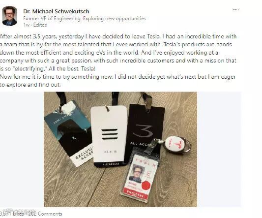 这或许能够解释为何在Model Y发布后不久,特斯拉动力系统以及车辆噪音工程部(Drive Systems & Vehicle NVH)副主任迈克尔·施韦库茨(Michael Schwekutsch)就在职业社交网站LinkedIn上宣布离职。这可能暗示在未做好准备的情况下,马斯克匆忙发布Model Y,才导致了他的离职。