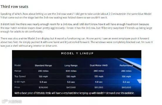 特斯拉发布的Model Y与Model 3非常相似,只有几处微小的变化。马斯克似乎对Model Y的发布仪式完全不感兴趣,甚至懒得展示车门或第三排座椅,这是Model Y唯一的区别于Model 3的两个地方。事后测试驾驶汽车的人清楚地注意到第三排座位不适合任何成年人。在大多数试驾中,特斯拉保持第三排座椅向下折叠,这样试驾者就看不出第三排座椅不是为成年人设计的。