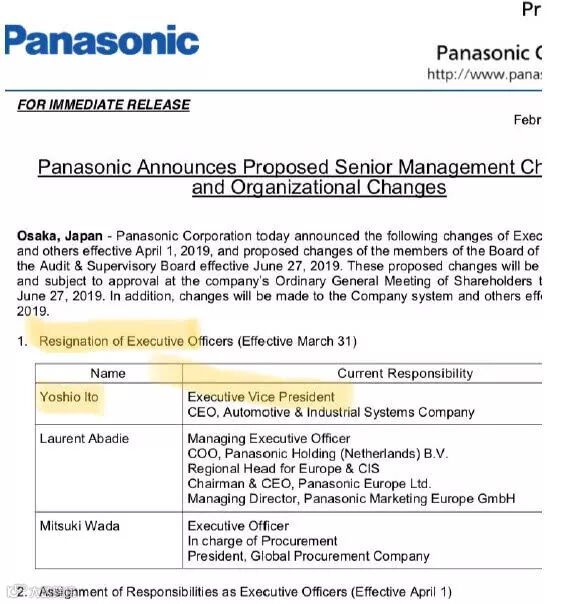 松下负责电池超级工厂的高管于2月底被解雇。根据马斯克的说法,特斯拉在2018年第三季度初“离破产只有数周时间”,松下同意重新修改其超级工厂合同,将2018年到期的合同承诺或支付承诺推迟至2019年。