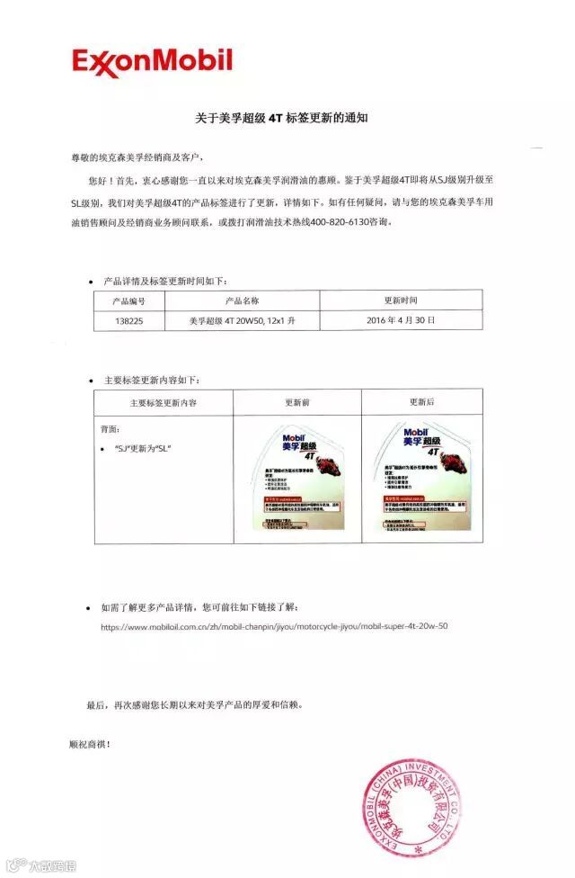 导读:美孚® 超级4T 20W-50 1L装将会把API由SJ级升级至SL级升级后背后便签参数将作变化相关公关文件