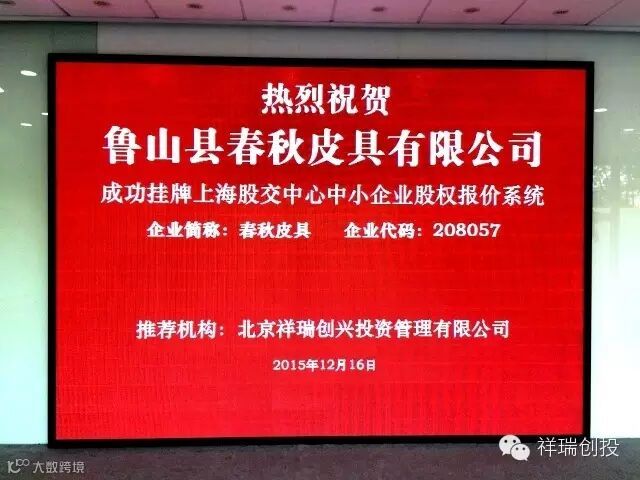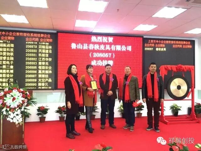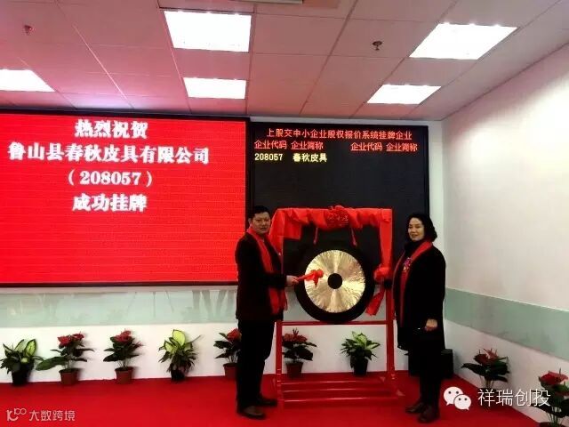 祥瑞创兴投资管理有限公司推荐的鲁山县春秋皮具有限公司(208057)成功挂牌上股交,顺利迈出与资本市场对接的第一步。