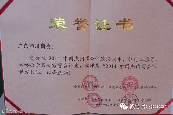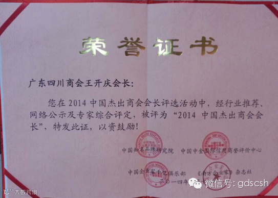 会上,广东四川商会、会长王开庆及秘书长何扬宇分别获得了“2014中国杰出商会”、“2014中国杰出商会会长”及“2014中国驻粤商会杰出秘书长”的光荣称号,我会常务副会长黄勇代表我会及王开庆会长上台接受奖牌与获奖证书。