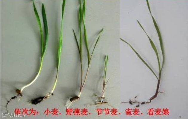 野燕麦的根茎部是白色的,雀麦、节节麦、看麦娘的根茎部是紫红色。