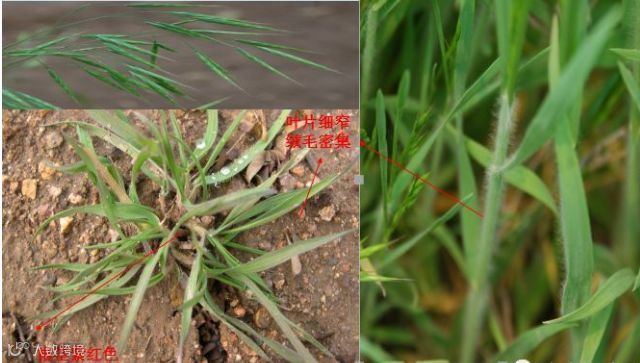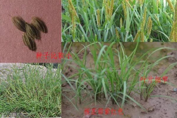 这几种杂草在幼苗阶段和开花前的阶段,形态上不太好区分,我 们可以通过它们的根茎部颜色、叶面、叶舌、种子形态等方面进行区分。