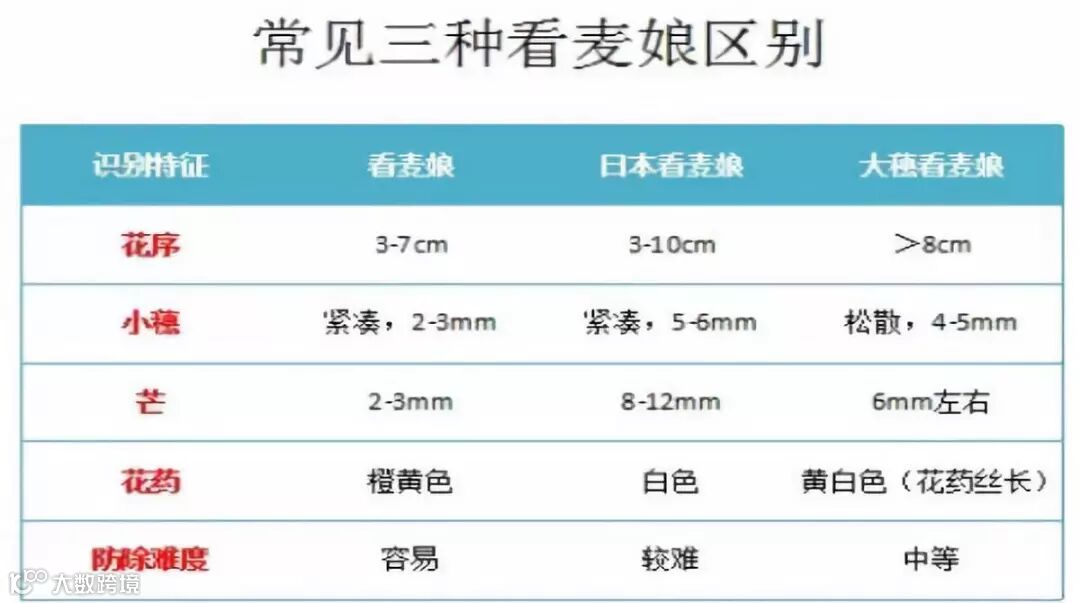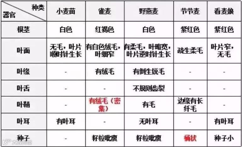 这里有一个关于这几个杂草的识别特征对比表,大家可以参照对比一下。