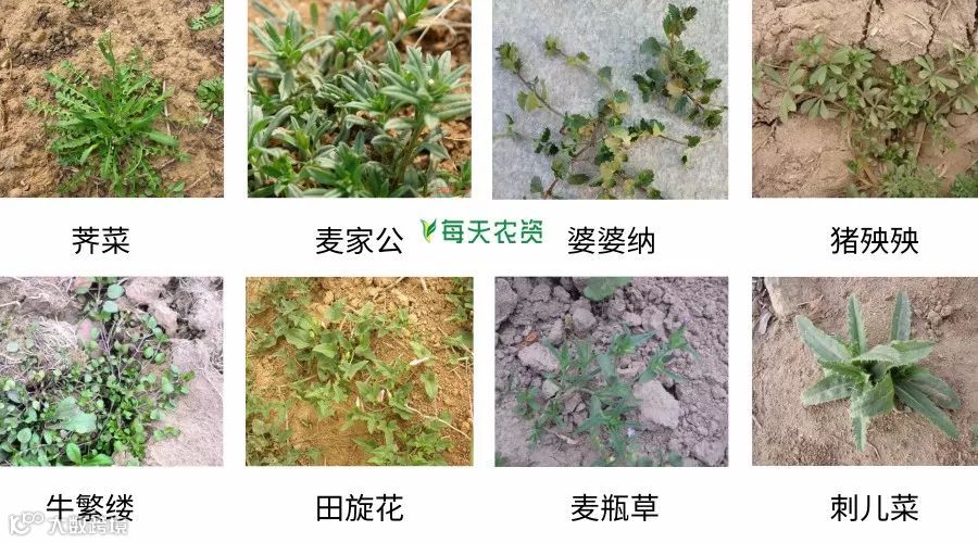 播娘蒿、猪殃殃、婆婆纳、小藜、荠菜、麦瓶草、麦家公、刺儿菜、田旋花等。