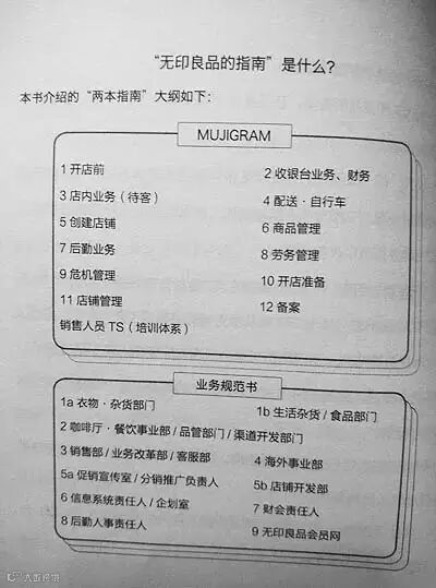 《解密无印良品》是由松井忠三先生著作的,它解释了MUJI的成功逆袭归于管理手段的优化即两大指南:(1)MUJIGRAM:无印良品店铺使用的经营指南;(2)业务规范书:将店铺开发部门和策划室等本部业务整合到一起的指南。