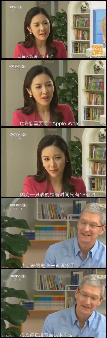 5月18日消息,苹果公司CEO近日接受了央视《财经周刊》采访,就环保、中国市场、乔布斯等话题展开了讨论。在专访过程中欢乐点很多。例如,主持人询问库克,每天是否真的只睡4个小时,如果那样的话,一块苹果手表显然是不够的。对此,库克也风趣的回答道,他一块手表的电池就足够了。