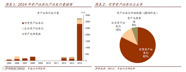 2014年,资产证券化发行量猛增,主要由银行发起的信贷资产证券化主导,其基础资产主要为企业贷款。