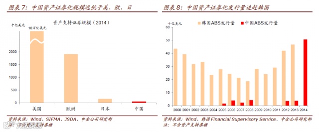 根据最新数据,不包括资产支持票据在内,美国资产支持证券存量10 万亿美元,欧洲1.77 万亿美元,日本1533 亿美元,而中国2014 年底只有464 亿美元,和发达国家存在较大差距(图表7)。2014 年中国资产支持证券发行量有可能超过韩国,但存量和韩国相比仍有差距(图表8)。