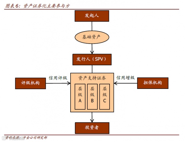 从微观看,资产证券化是参与主体利益最大化行为的结果。资产证券化参与主体包括发起人、发行人和投资者,以及承销商、资金托管机构、担保方、评级机构、法律顾问等中介服务机构(图表6)。资产证券化的主要动力来自发起人和投资者,中介机构可以从中赚取服务费。