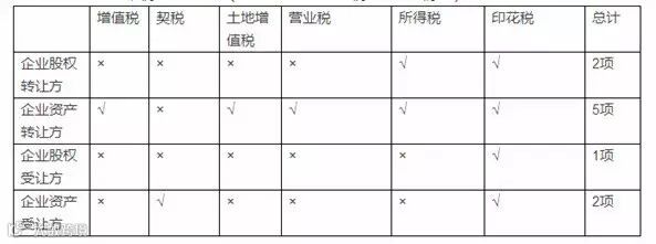 在企业资产转让中,资产转让方须缴纳:所得税、营业税、土地增值税、印花税、增值税;资产转让方不须缴纳:契税、增值税(企业改制重组);资产受让方须缴纳:契税、印花税;资产受让方不须缴纳:所得税、营业税、土地增值税、增值税。
