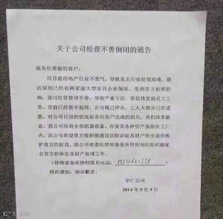 9月9日,深圳华仁实业公司在其工厂门口贴出告示宣告倒闭。告示称,因房地产行业不景气,家具企业生存艰难,而华仁公司经营管理不善,严重亏损,资不抵债,只能选择停业。据称,目前该公司员工工资也是借债发放。