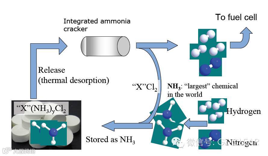 所谓的固态储存氨就是利用一些对氨气有强烈吸附作用的的固态物质来存储氨气的技术。其中丹麦的Amminex公司是固态储存氨技术方面的佼佼者。研究人员,找到相关的对氨有强吸附的材料,如氯化锶盐和氯化镁盐等,经过特定的工艺制作成高比表面的筛孔材料,然后用不锈钢壳进行封装。