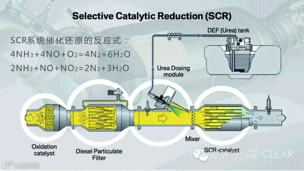 选择性催化还原系统(SCR)因为其经济性和高效性已经成为柴油车尾气的主要处理手段。车用尿素作为SCR系统的还原介质广泛使用。车用尿素溶液从尿素喷嘴喷射到SCR催化系统中,进行高温雾化后转化成氨气(NH3)和二氧化碳(CO2)。在催化剂的作用下,氮氧化物(NOx)与氨气在排气管内进行反应,将废气中的有害氮氧化物转化成无害的氮气和水排放到大气中。