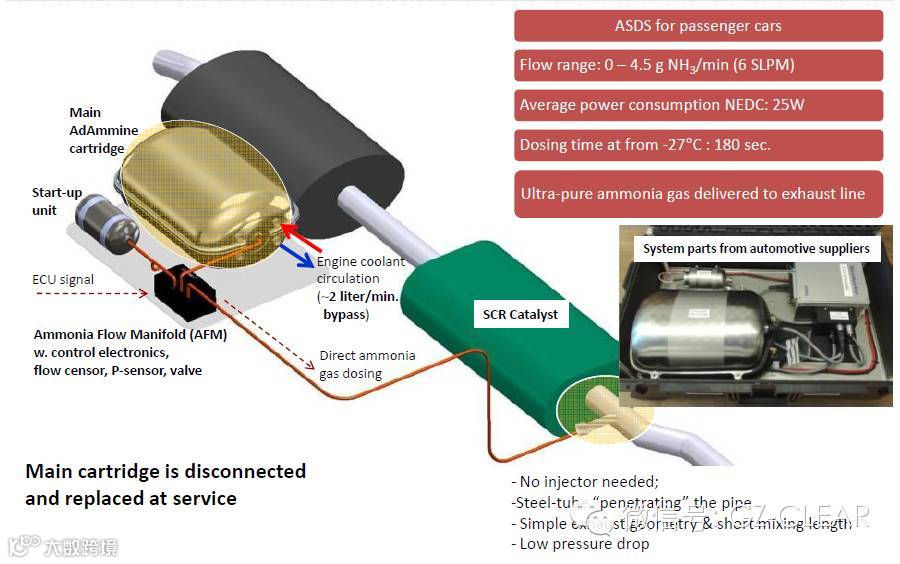 Amminex的这一技术吸引了众多巨头的注意,2011年法国汽车零部件及尾气处理巨头佛吉亚(FAURECIA)入股 Amminex,共同推出了一个名叫ASDS的系统。ASDS是Ammonia Storage Delivery System氨储存和输送系统缩写,这是由佛吉亚联合Amminex共同开发的,将纯氨储存在原材料是氯化锶盐的AdAmmineTM桶装容器中。ASDS释放的氨能将商用车尾气所排放的氮氧化物转化为无污染的氮和水。发动机启动时,ASDS单元受电加热,在1-3min内释放纯氨(而车用尿素则需要10-15min的时间才能制造氨气),纯氨在低压控制下进入控制单元,在电阀门的引导下进入排气管。当发动机关闭的时候,氨气释放停止,剩余的纯氨冷却并重新储存到氯化锶盐中。