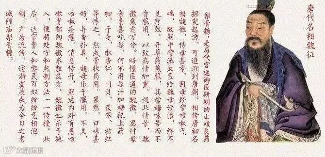 据说,魏征母亲患有咳疾,久病不愈却不肯服药,母亲喜欢吃梨,略懂医道的魏征就“以梨汁与百草为伍,煮之,味纯润肺”。数日,母亲见愈。这就是最早的“宫廷古方梨膏糖”。