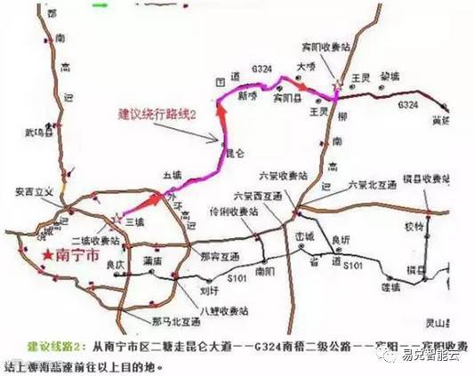 建议线路2:从南宁蒲庙镇走S101省道—刘圩—南阳—峦城—横县—横县高速公路收费站走G80广昆高速前往。