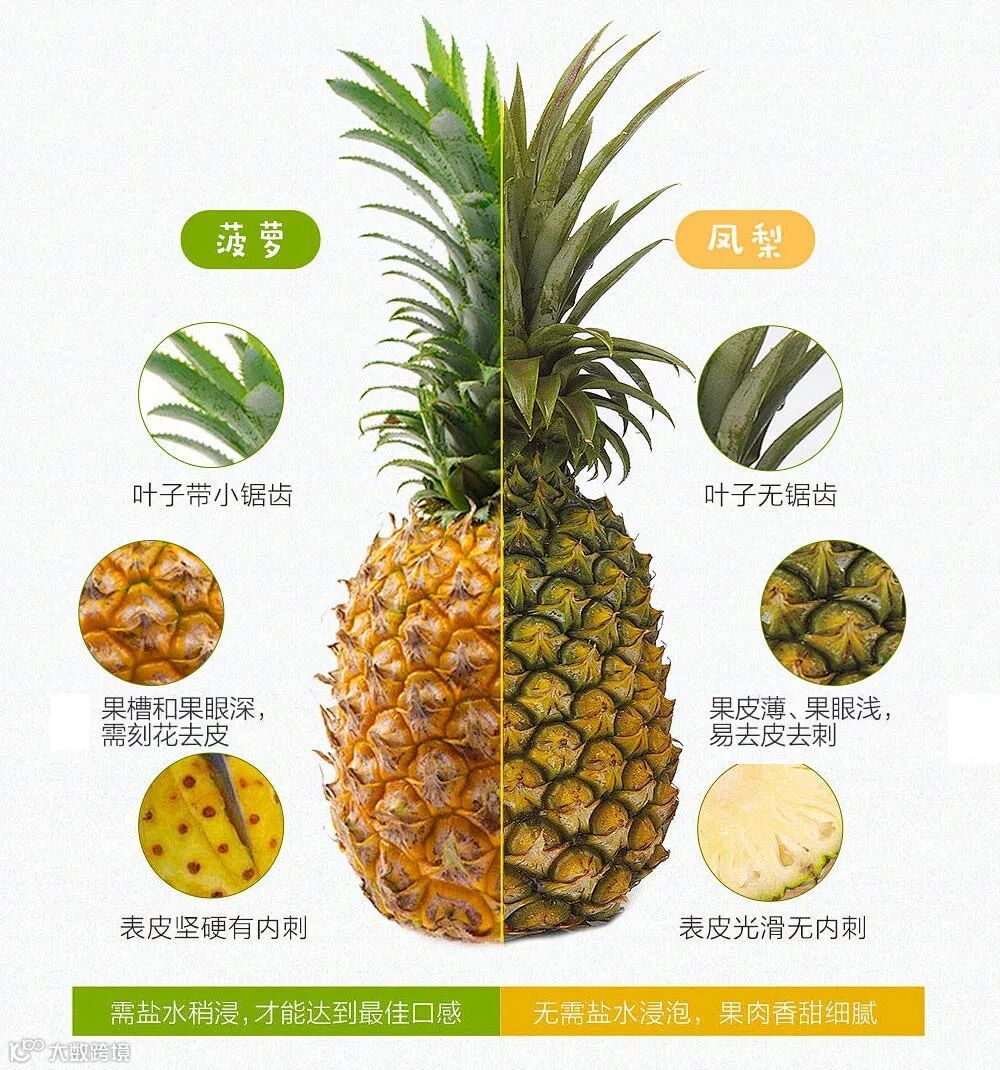 口感差异:凤梨果肉无内刺,无需挖眼,口感清甜多汁,可直接食用。菠萝果肉有内刺,需要挖眼处理,且口感偏酸甜,果肉含有菠萝蛋白酶,这种酶具有分解蛋白质的能力,所以吃起来会感觉刺痛,但是盐水能够有效减少这种酶的活性,所以菠萝需泡盐水后食用。