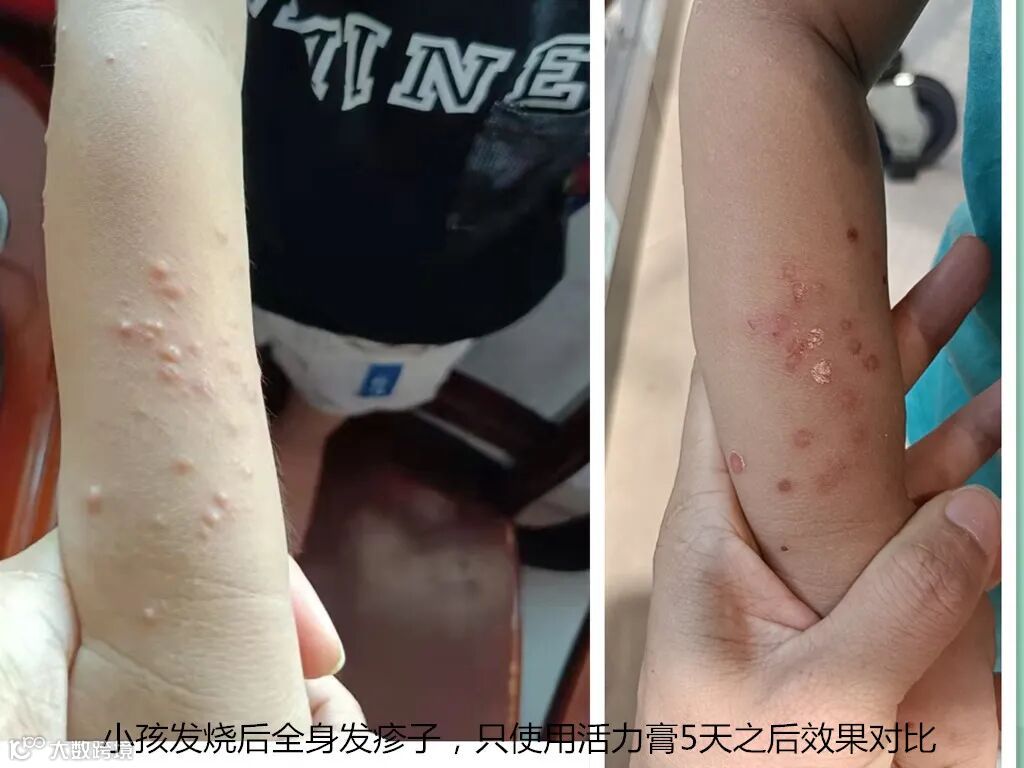 1. 同事小孩发烧后四肢起疹,涂抹活力膏5天改善很多。