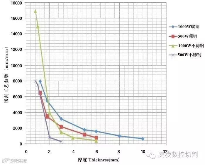 500W与1000W光纤激光器切割机的切割工艺参数对比图。还是以碳钢材料为例,如图所示,2mm以下的碳钢使用500W光纤激光设备切割的最高速度约为每分钟6.6米,使用1000W机器切割的最高速度约为每分钟8米;6mm碳钢使用500W光纤激光设备切割的最高速度约为每分钟0.8米,使用1000W光纤激光设备切割的最高速度约为每分钟1.6米,依此类推。