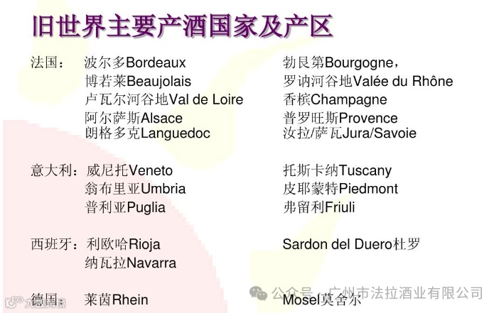 旧世界国家主要包括位于欧洲的传统葡萄酒生产国,如法国、意大利、德国、西班牙和葡萄牙以及匈牙利、捷克斯洛伐克等东欧国家。它们大多位于北纬20-52度之间,拥有十分适合酿酒葡萄种植的自然条件。冬暖夏凉、雨季集中于冬春而夏秋干燥的气候以及优质的土壤等自然条件,让这些国家在葡萄酒种植和酿造上占有先天的优势。从法国、意大利、西班牙三国葡萄酒年产量近乎占世界葡萄酒生产总量的60%便可见一斑。
