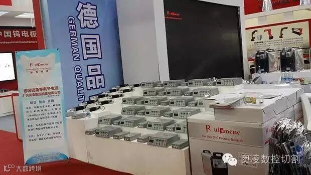 陈列架展示着德国锐盾品牌的等离子电源、弧压调高器、电容调高器等产品