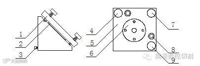 1、反射镜调整板 ;2、反射镜 ;3、锁紧螺丝 ;4、调节螺丝M1 ;5、反射镜调整板 ;6、反射镜压紧板 ;7、调节螺丝M ;8、锁紧螺丝 ;9、调节螺丝M2。