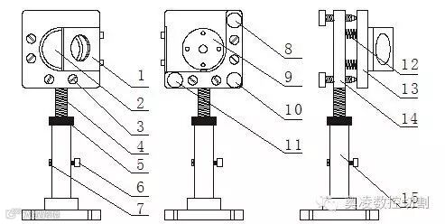 1、光靶放置架 ;2、反射镜 ;3、拉簧锁紧螺丝 ;4、调节螺杆 ;5、调节螺母 ;6、锁紧螺丝a ;7、锁紧螺丝b ;8、调节螺丝M1 ;9、反射镜锁紧片 ;10、调节螺丝M ;11、调节螺丝M2 ;12、拉簧 ;13、反射镜安装板 ;14、支撑板 ;15、底座。